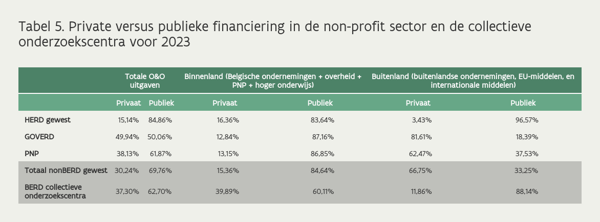 Tabel 5 geeft voor de non-profit sector en de collectieve onderzoekscentra een berekening van publieke en private financiering in 2023. Bijna 70% van de O&O-uitgaven van de non-profit zijn gefinancierd door publieke financieringsmiddelen. De binnenlandse financieringsmiddelen zijn voornamelijk publieke middelen en de buitenlandse financieringsmiddelen voornamelijk private middelen. De O&O-uitgaven van de publieke onderzoekscentra (GOVERD) wordt bijna voor de helft gefinancierd door private onderzoeksmiddelen en de buitenlandse private financieringsmiddelen vormen een zeer belangrijke financieringsbron. De O&O-uitgaven van het hoger onderwijs (HERD) worden voor iets meer dan 15% gefinancierd door private financieringsmiddelen.