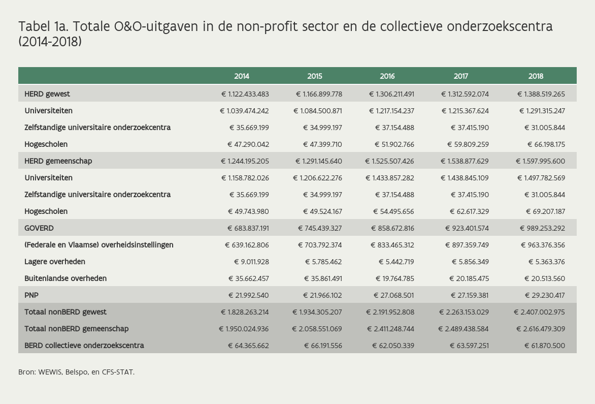 Tabel 1a en Tabel 1b geven voor de non-profit sector en de collectieve onderzoekscentra een evolutie van de O&O-uitgaven tussen 2014 en 2023 (voltijdse eenheden) weer. De totale O&O-uitgaven van de non-profit (gewestbenadering) bedroegen 3,63 miljard euro in 2023, een stijging van ongeveer 50% ten opzichte van 2018. De O&O-uitgaven van het hoger onderwijs (HERD) kwamen op 2,03 miljard euro en de O&O-uitgaven van de publieke onderzoekscentra (GOVERD) op 1,54 miljard euro. Het aandeel van het hoger onderwijs in de totale non-profit sector bedraagt 56% en dat van de publieke onderzoekscentra ongeveer 42%. De O&O-uitgaven van de GOVERD zijn sterker gestegen dan die voor de HERD tussen 2018 en 2023. De top 10 O&O-actoren uit de non-profit zijn goed voor meer dan 90% van de O&O-uitgaven van de non-BERD.