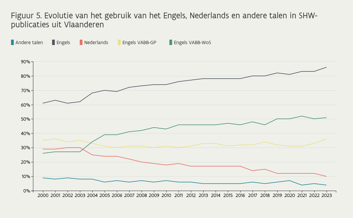 De gegevens verzameld in het VABB-SHW wijzen op het groeiende belang van het Engels als wetenschapstaal in de sociale en humane wetenschappen beoefend in Vlaanderen. Figuur 5 illustreert dat het percentage Engelstalige publicaties over alle publicatietypes tussen 2000 en 2023 steeg van 61% tot 86%. Andersom verminderde het aandeel Nederlandstalige publicaties van 29% naar 10%. Ook het aandeel van publicaties in andere talen kende een daling van 9% naar 4%. De grootste veranderingen hebben plaatsgevonden in de periode 2000-2009.